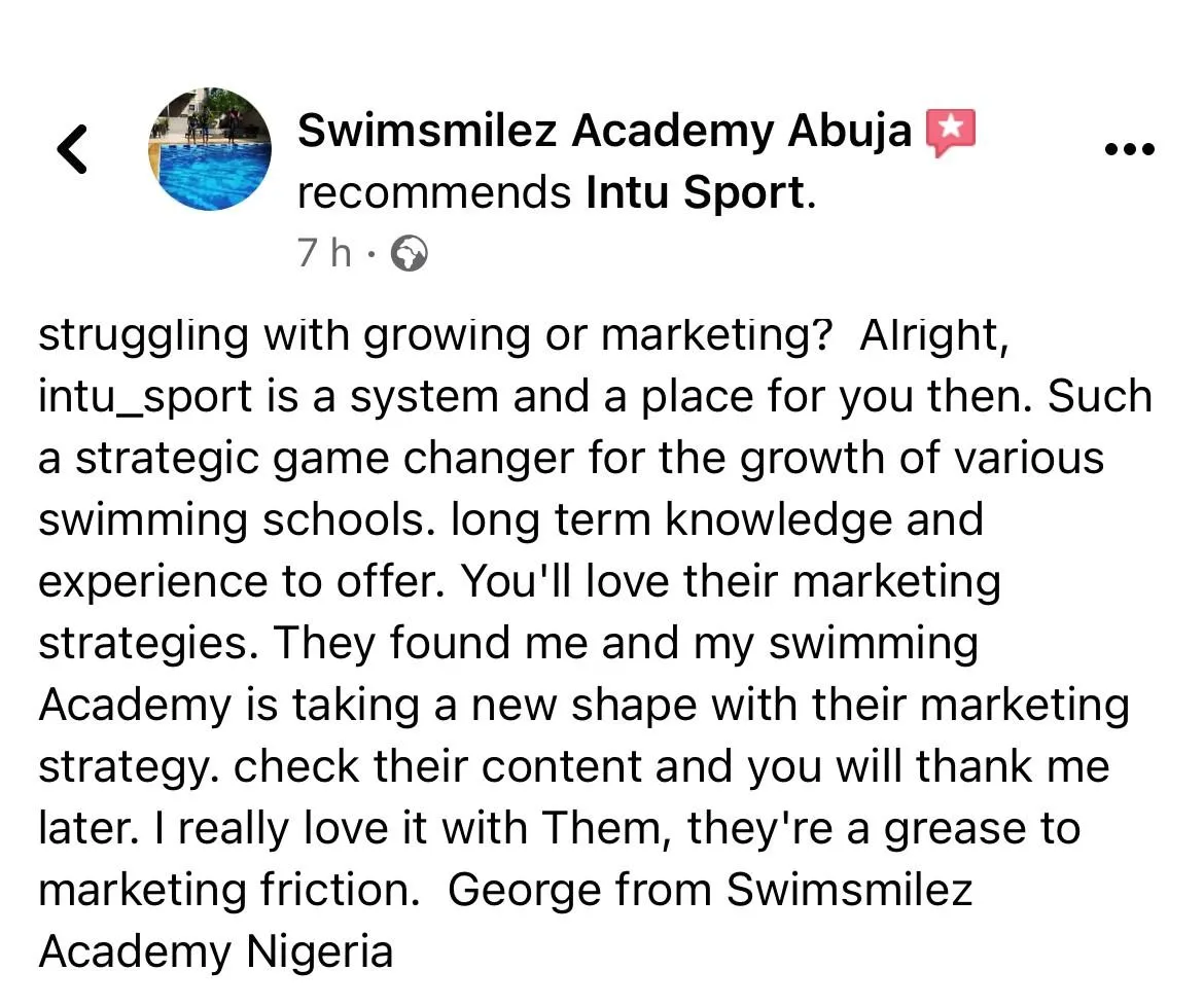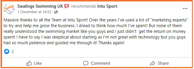 After the sale of our business we decided to turn our coaching skills into helping other swimming schools to market their business as we had done through implementing the Intu Sport C.L.U.B system.